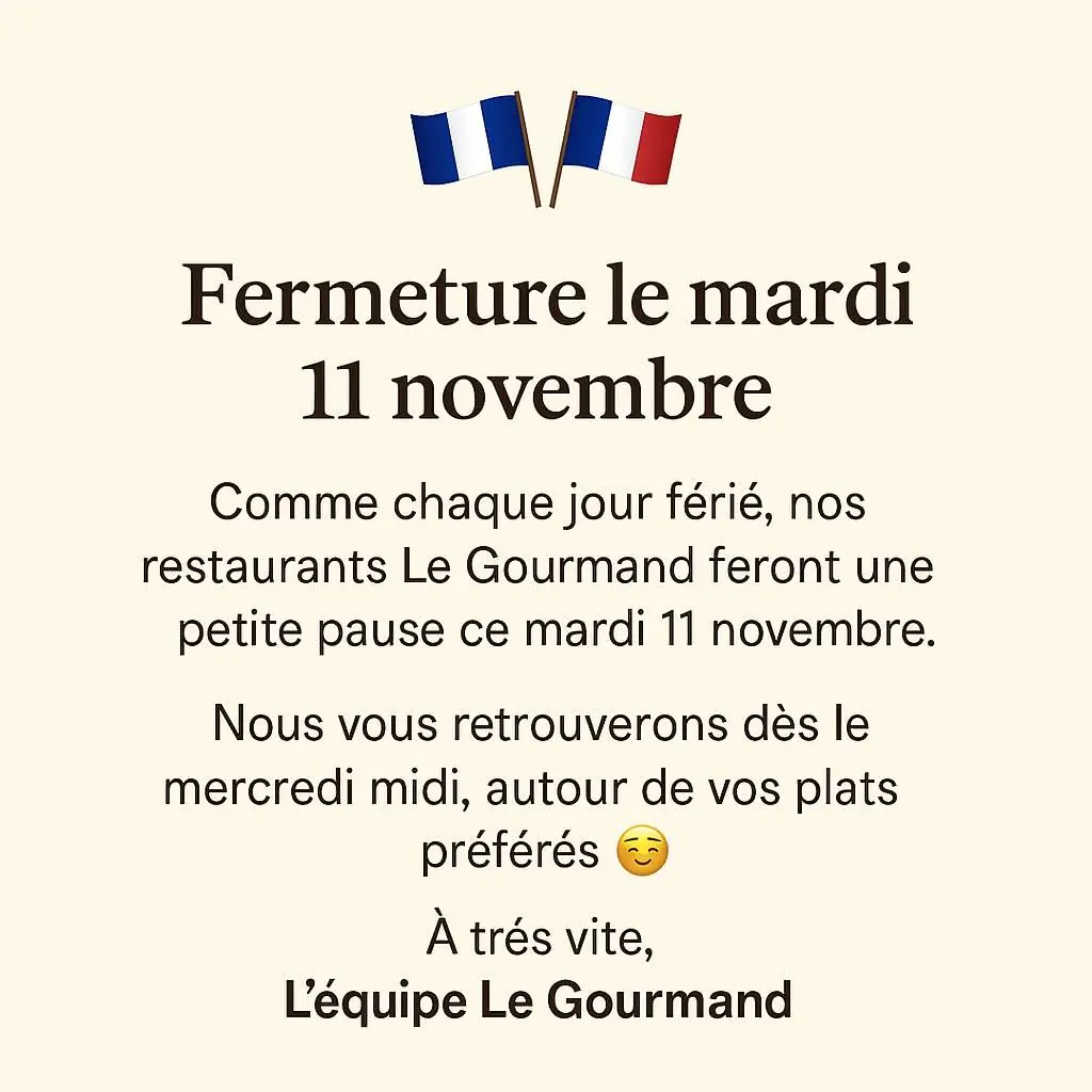 Comme chaque jour férié, nos restaurants Le Gourmand feront une petite pause ce lundi 11 novembre.On se retrouve dès le lendemain midi pour partager un bon moment autour de vos plats préférés
